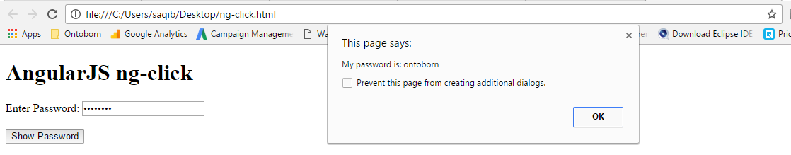 In the above example, ng-click directive is used to call a DisplayMessage() function with the ‘password’ parameter when a user clicks a button. A ‘password’ is a model property defined using ng-model directive in the input box. The DisplayMessage() function is attached to a $scope object in myController, so it will be also accessible from button click as button comes under myController. The $window service is used to display an alert.