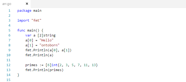 You can initialize array in Go either one by one or using a single statement as follows: