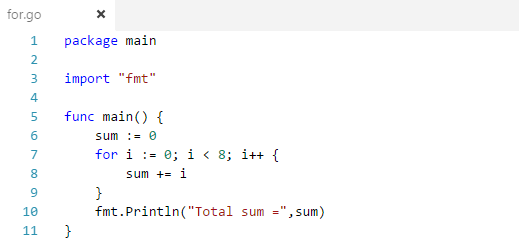 Note: Unlike other languages like C, Java, or Javascript there are no parentheses surrounding the three components of the for statement and the braces { } are always required.