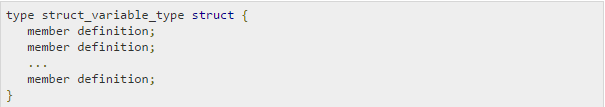 To define a structure, you must use type and struct statements. The struct statement defines a new data type, with more than one member for your program. type statement binds a name with the type which is struct in our case. The format of the struct statement is this: