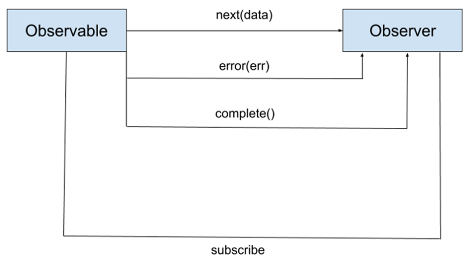 In Reactive Programming, also called Rx programming, data is emitted by one component, and RX library/framework will send the changes to another component that is registered to receive those changes. There are three components in the Reactive Programming as follows