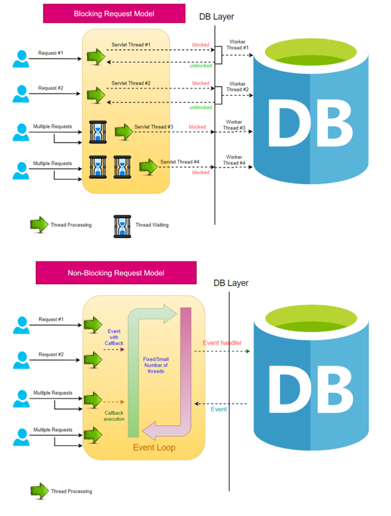 Most of the real-world applications are blocking in nature i.e they use blocking or synchronous calls. In the above diagram under the Blocking Request model, you can see that the server (Servlet Container) creates a new thread for every incoming request and all of them are waiting for the response from the database and hence blocked. This will consume a lot of resources and the new requests will be stalled bringing the entire application to a standstill.